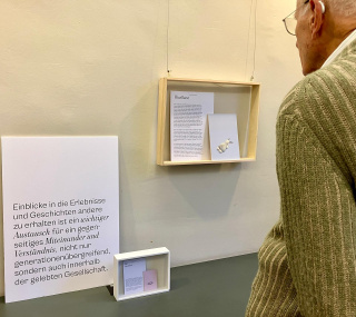 Zwischen heute und vorgestern — Erinnerungsobjekte und ihre Geschichten präsentiert persönliche Erinnerungen und animiert eigene Erinnerungen zu teilen. Die Ausstellung gibt Aufschluss darüber, wie Geschichten für einen selbst, die Familie und für Freunde sichtbar gemacht werden und erhalten bleiben können. Das Objekt dient dabei als Träger der Erinnerung. Es hilft beim Zurückdenken und beim Erzählen.